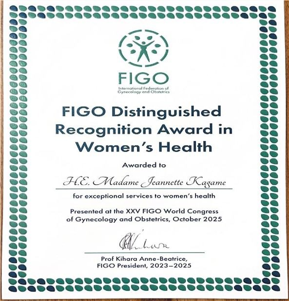 Rwanda’s First Lady, Jeannette Kagame, has been honored with the FIGO Distinguished Recognition Award in Women’s Health by the International Federation of Gynecology and Obstetrics (FIGO) for her long-standing efforts to promote women’s health and empowerment.