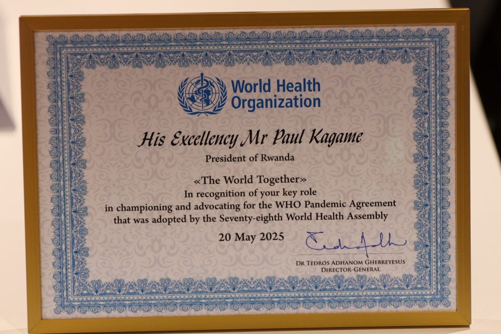 The World Health Organization has recognized Rwandan President Paul Kagame for his leadership in global efforts to prevent and combat pandemics.